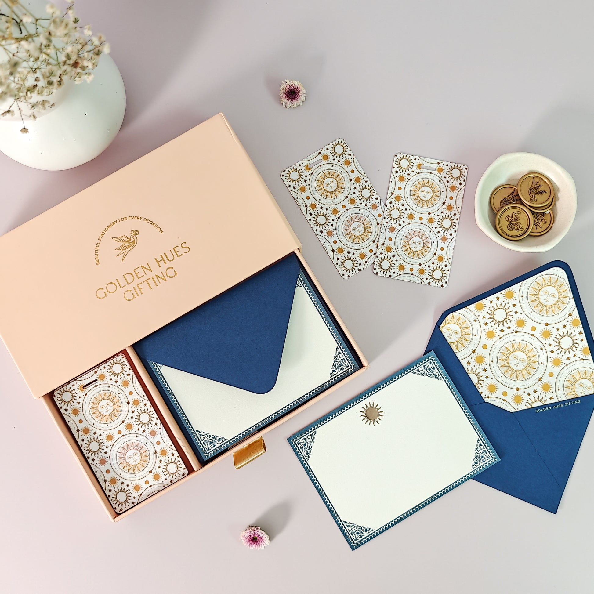 Elevate your messages with our exquisite Golden Sun stationery set. This collection gracefully marries a dreamy cosmos-inspired print with charming vintage motifs and the ethereal patterns of the sun and moon, creating a unique and captivating aesthetic for your envelopes.