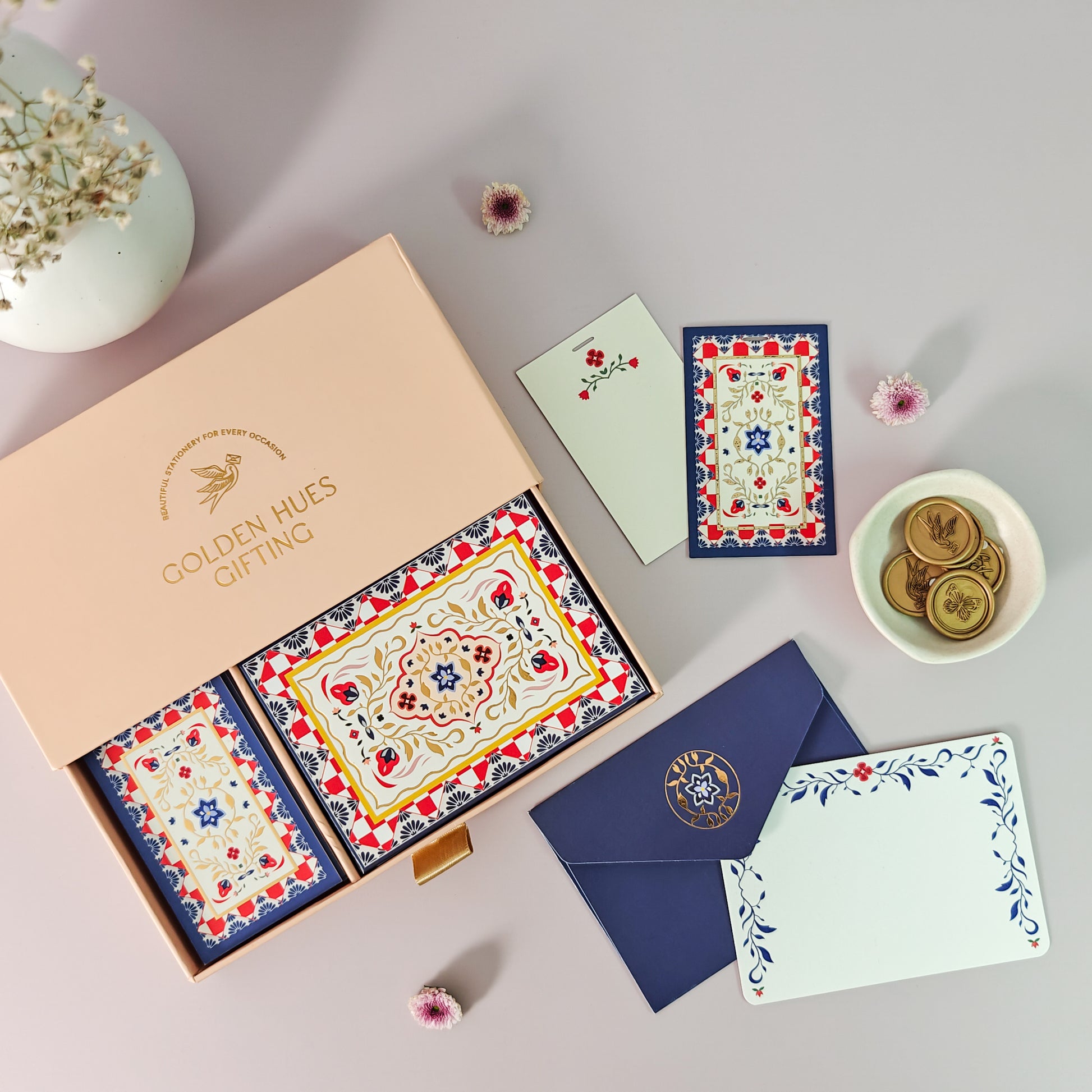 Experience the captivating beauty of our Mediterranean Dreams stationery set, celebrating the vibrant symmetry found in its art and architecture. The deep blues of the ocean blend seamlessly with the radiant reds and golds of the sun, transporting you to a world of elegance and wanderlust.