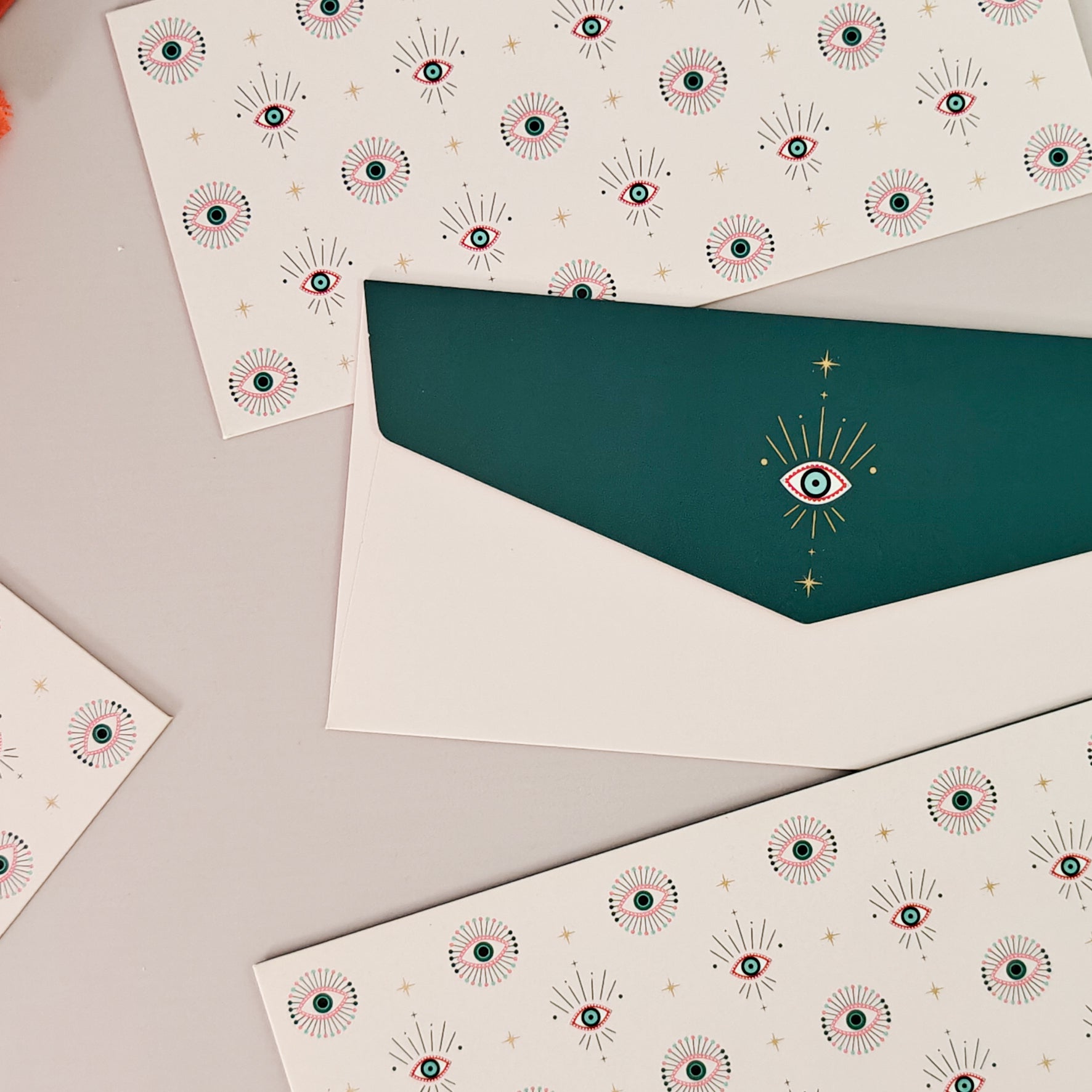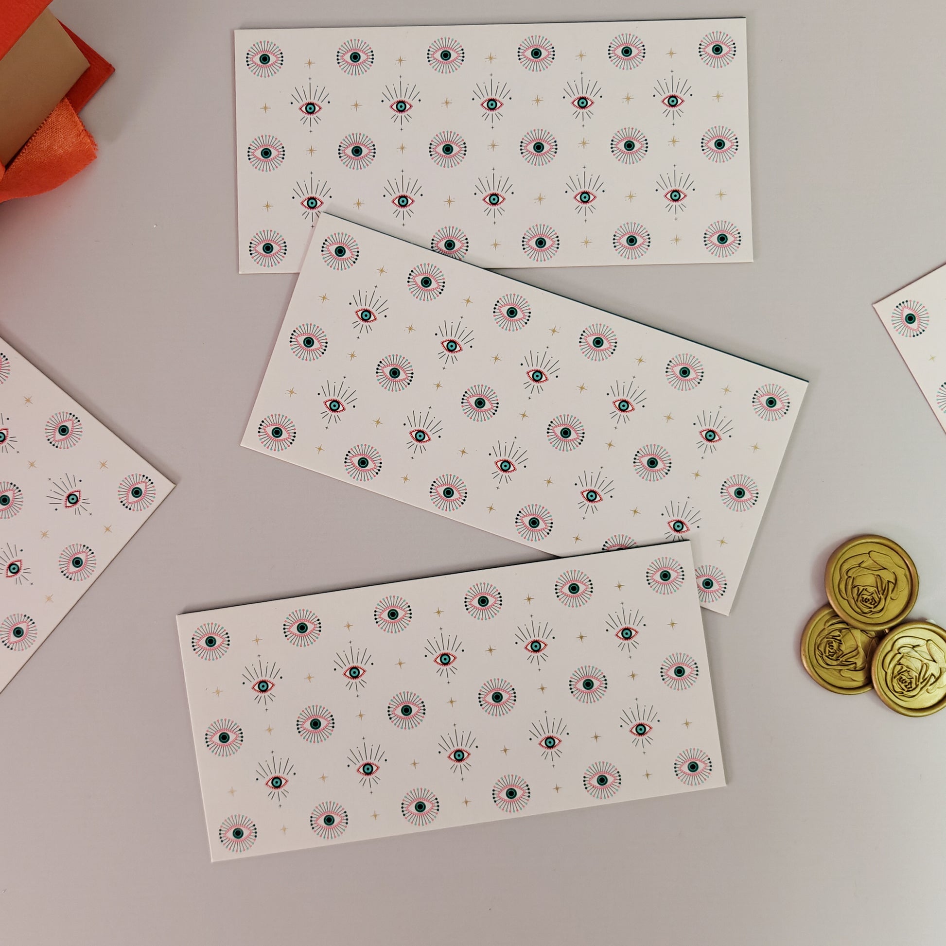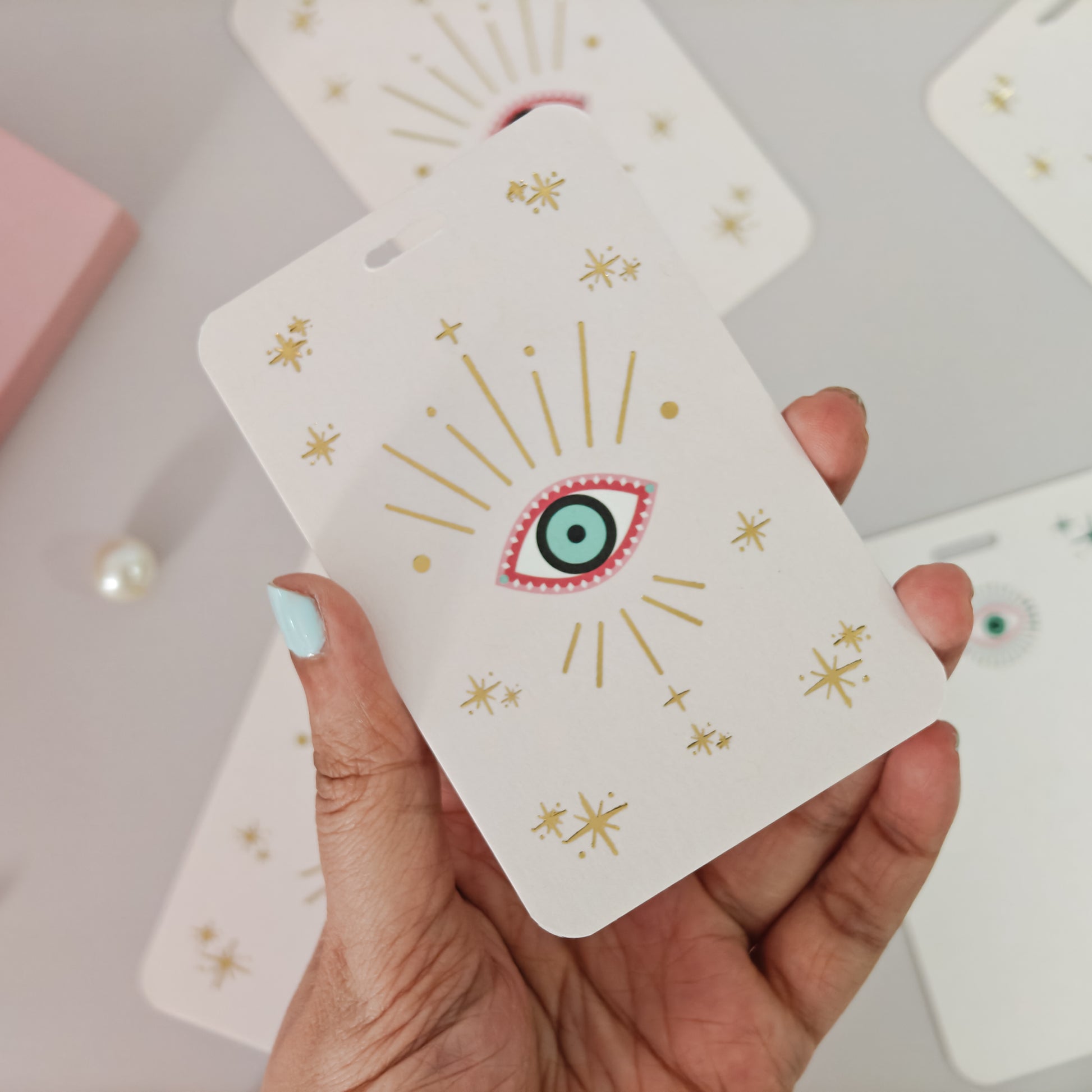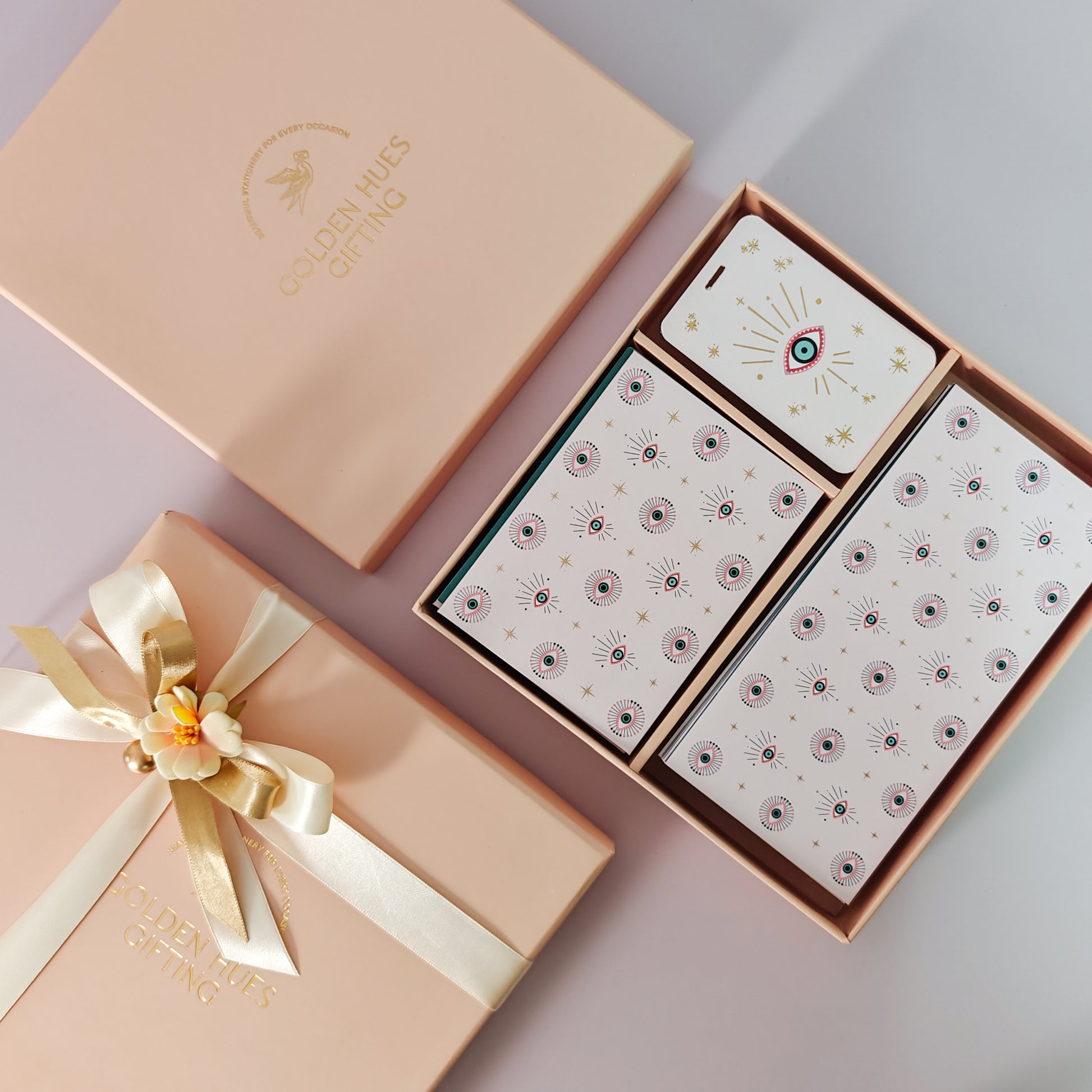 Discover the Nazariya Collection stationery set, a sophisticated stationery set that reimagines a timeless symbol. Its vibrant pale pink and turquoise blue Evil Eye print and luxurious gold foiling details bring a distinctive and elegant flair to your desk.