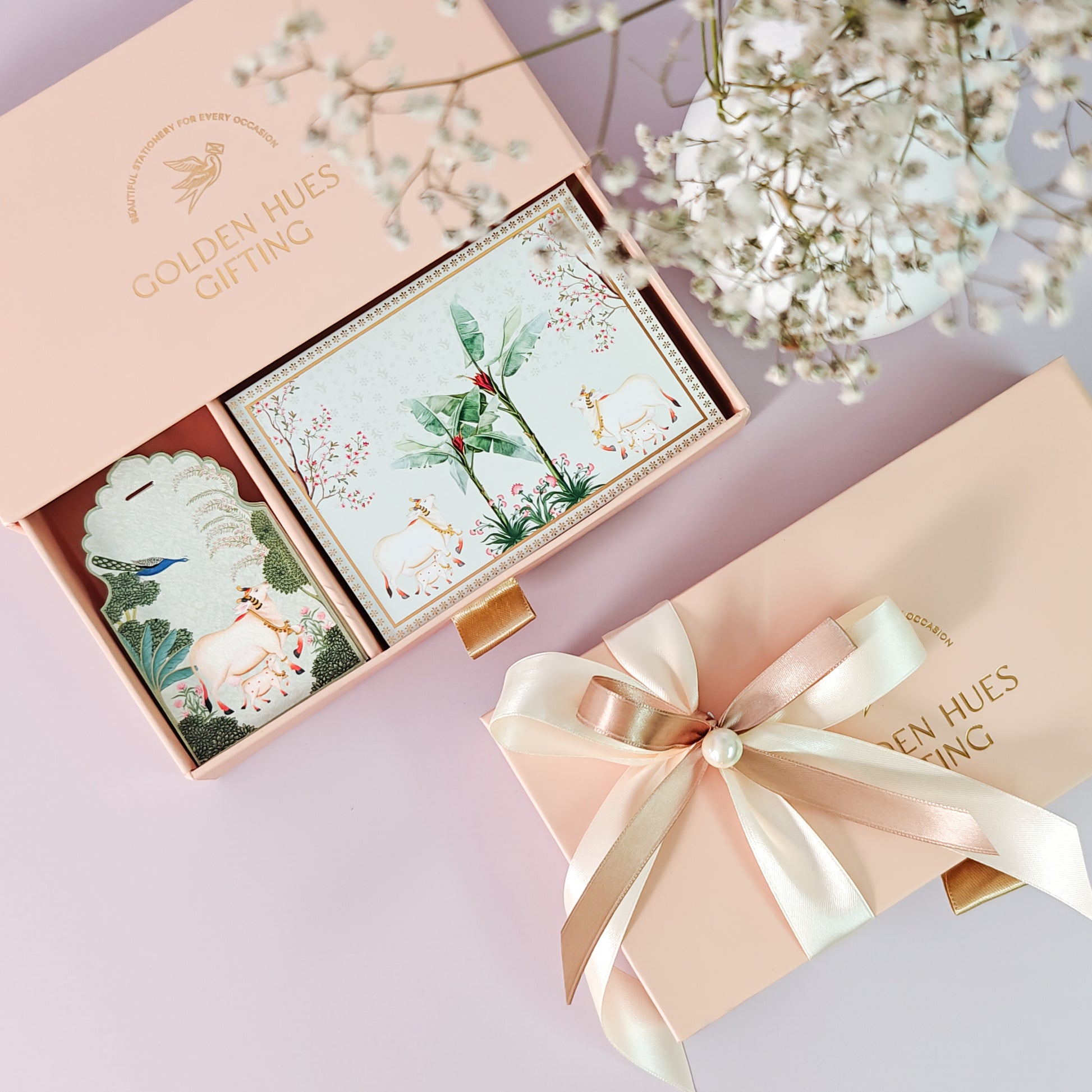 Discover the refined beauty of the Pichwai Collection (Green) Mini Gift Set. Featuring a modern take on Pichwai, an ancient Indian art form celebrated for its rich detail and vibrant storytelling, this set highlights traditional prints and motifs. A subtle background ensures these intricate designs are the true stars, exuding understated elegance.