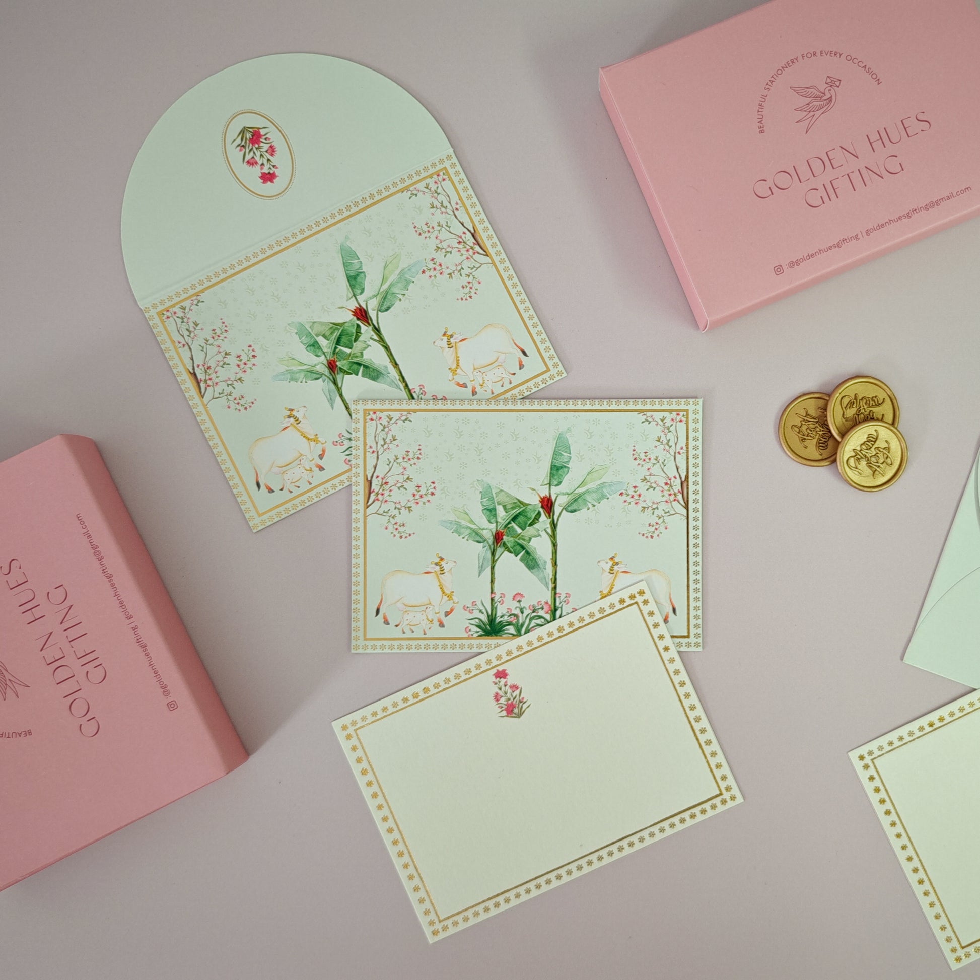 Our Pichwai Collection set offers a distinguished way to connect. With contemporary interpretations of timeless Pichwai art on a muted canvas, it brings an understated elegance to your thank you notes and personal messages, ensuring beautiful presentation every time.