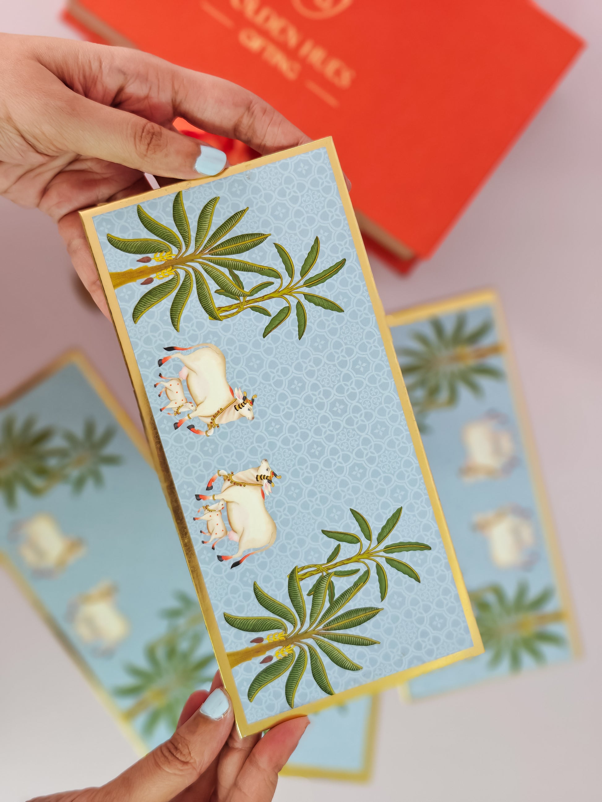 Make your gifts memorable with our sophisticated Sky Blue Money Envelope from the Pichwai Collection. Inspired by traditional Pichwai art, it boasts modern motifs on a calming light blue, enhanced by elegant gold details. This envelope transforms a simple gift into an artistic expression, ideal for any special occasion.