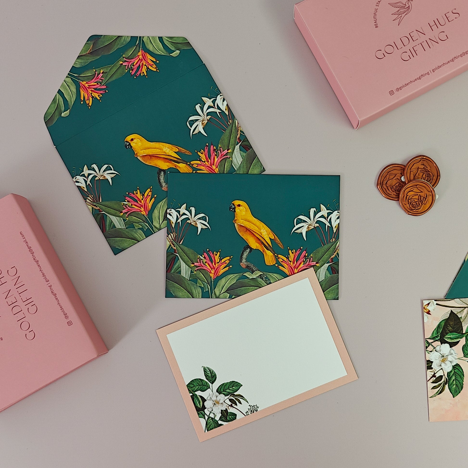 Make every message a journey with our captivating Birds of Paradise set. Adorned with a lush, vibrant print that captures the intricate details of tropical flora and fauna, it transforms your correspondence into an artful expression. Ideal for thank you notes, personal messages, or any occasion where you wish to convey your thoughts with sophisticated charm.