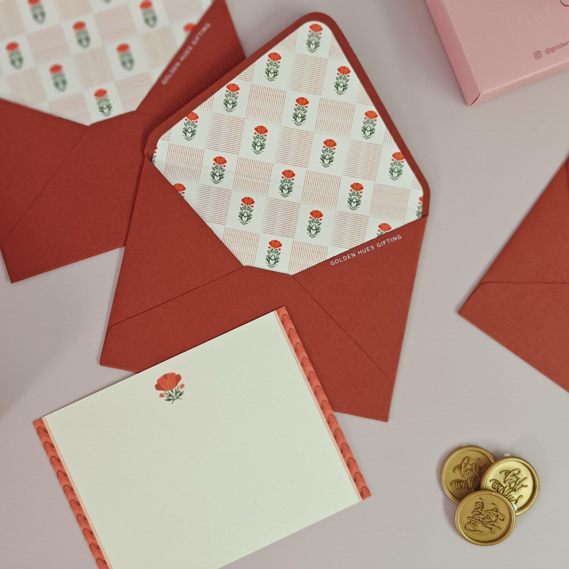 Make every note a statement with our sophisticated Rust-Colored Liner Envelope Stationery Set. The envelopes feature a captivating rust hue and are lined with intricate Indian motifs, adding an opulent touch to your messages. Ideal for thank you notes, personal correspondence, or any occasion where you wish to convey your thoughts with exceptional style.