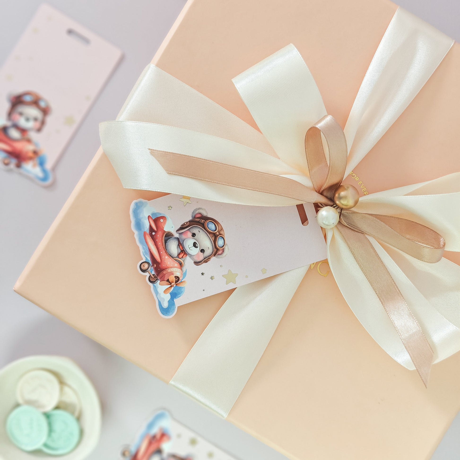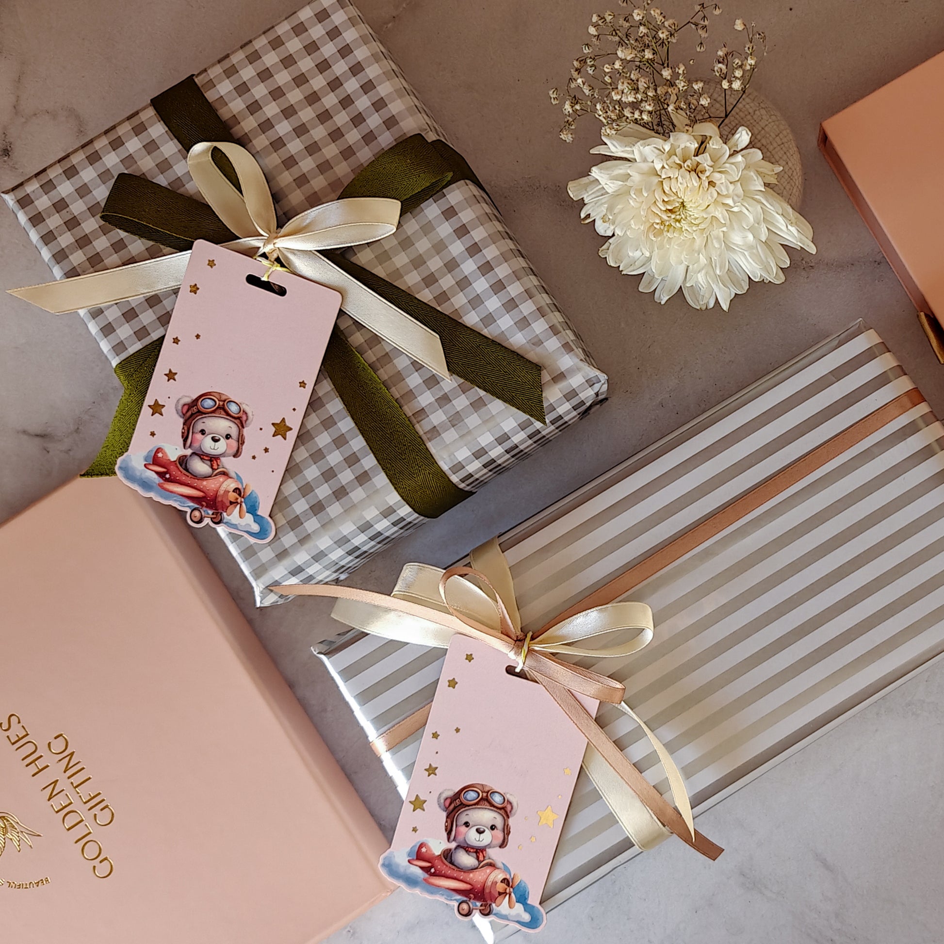 Add a touch of adventure to every gift with these whimsical shape-cut kids’ gift tags, featuring a little bear soaring high in a plane with shimmering gold foil details.